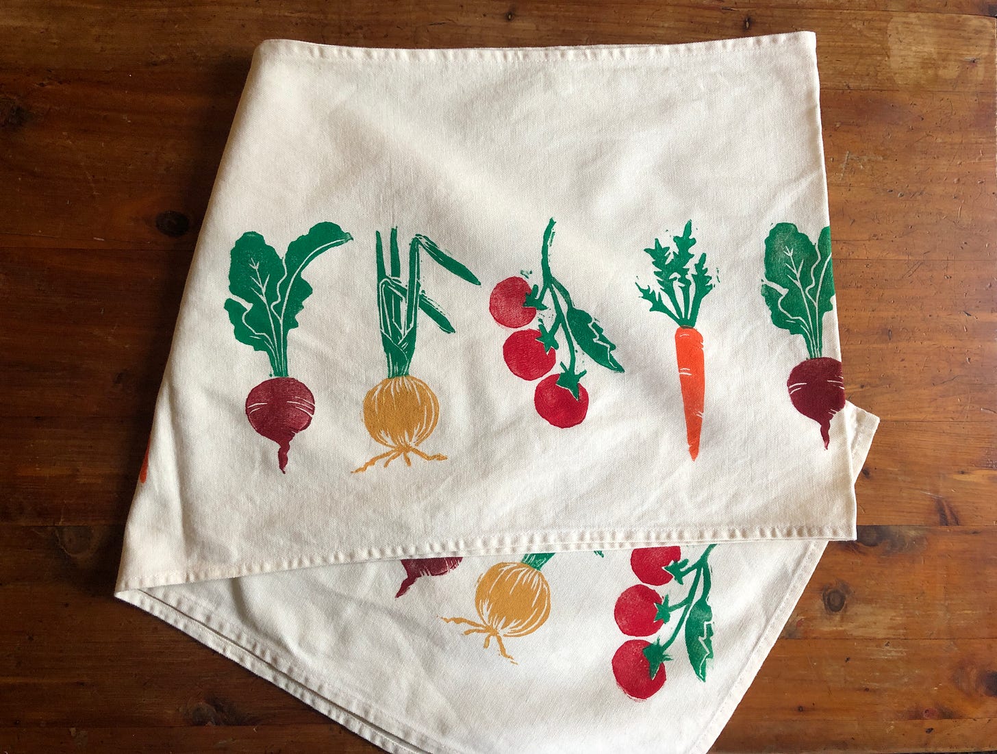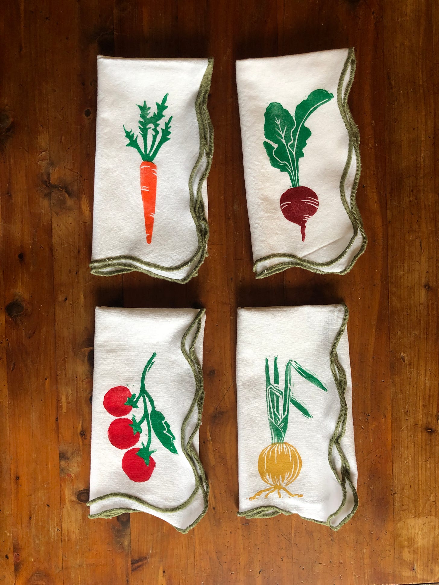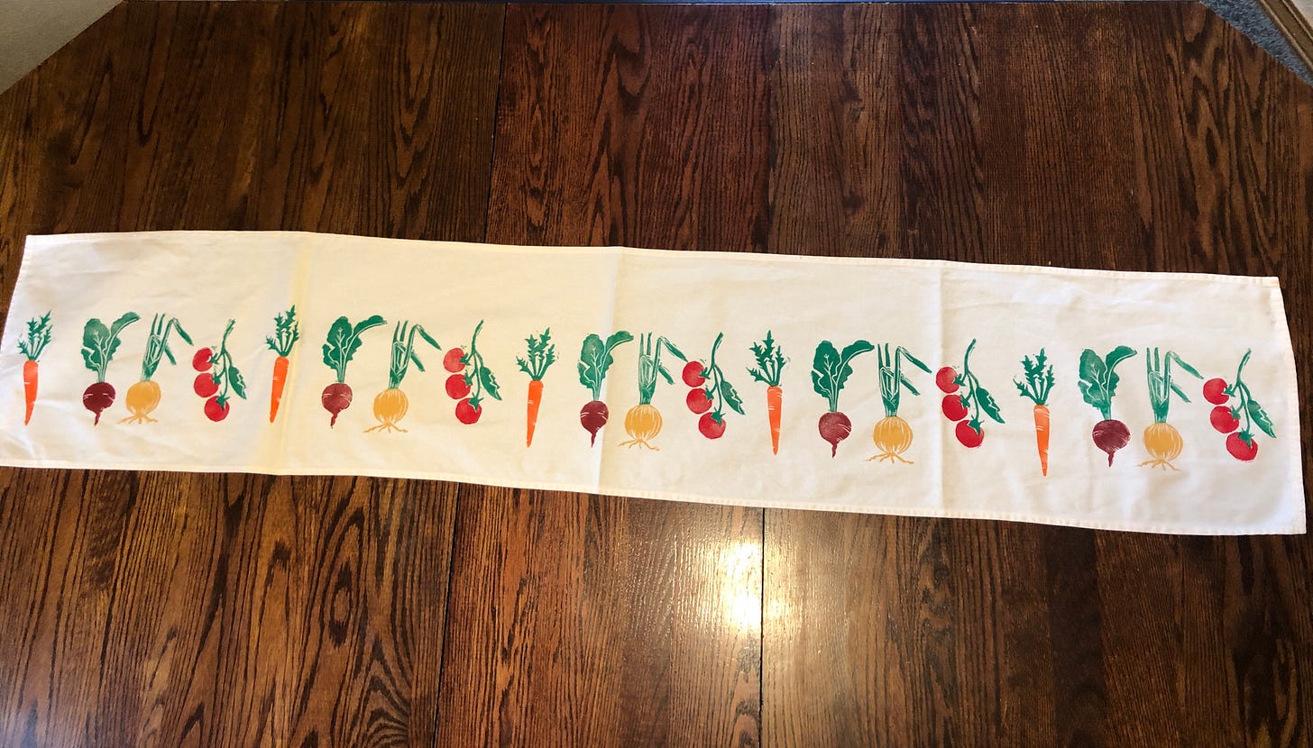 I made a veggie table runner I love. though, I will be centering the veggies on it a little more next time. I also did green trimmed veggie napkins. I loved growing radishes and tomatoes in my garden in SC. Veggies straight from the garden can’t be beat. Though my kids were traumatized by the amount of earwigs we had to shake out of the artichokes I grew. In the shop at Historic Hibiscus.